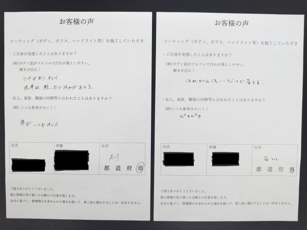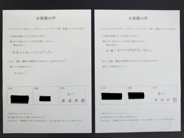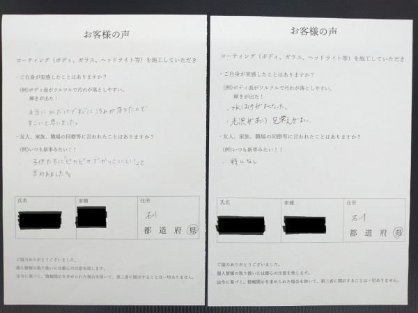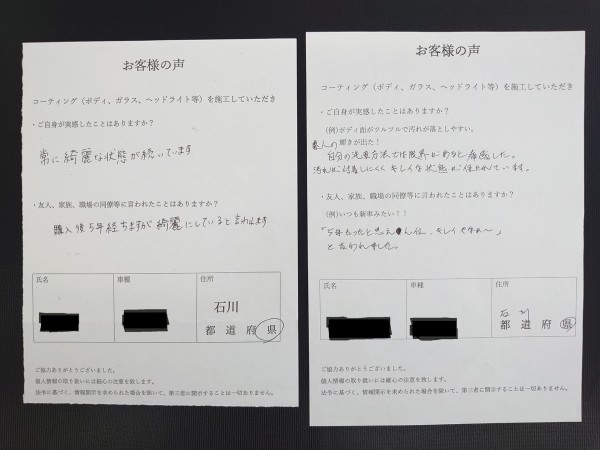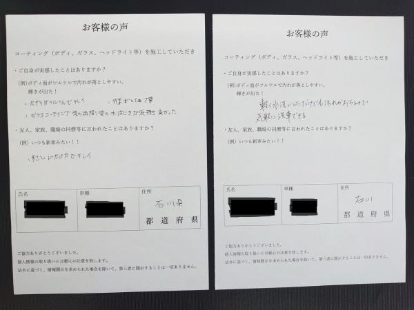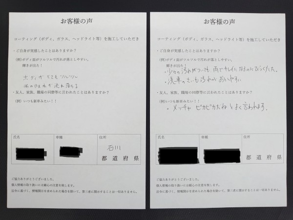 以前の車でもコーティングを依頼され、仕上がりと持ちに満足されたお客様。今回はブラックの車で、「黒の深みと艶が増して、晴天でも黒く見える」と喜ばれています。さらに、「友人が安いコーティングをしている...